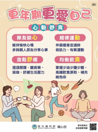 更年期更愛自己 更年期更愛自己 揪友談心-維持愉快心情,多與親人朋友分享心事 規律運動-伸展暖身並適時做肌力、有氧運動 放鬆舒緩-透過閱讀、聽音樂、瑜珈,舒緩生活壓力 均衡飲食-掌握少油少鹽少糖、高纖維飲食原則、補充維他命
