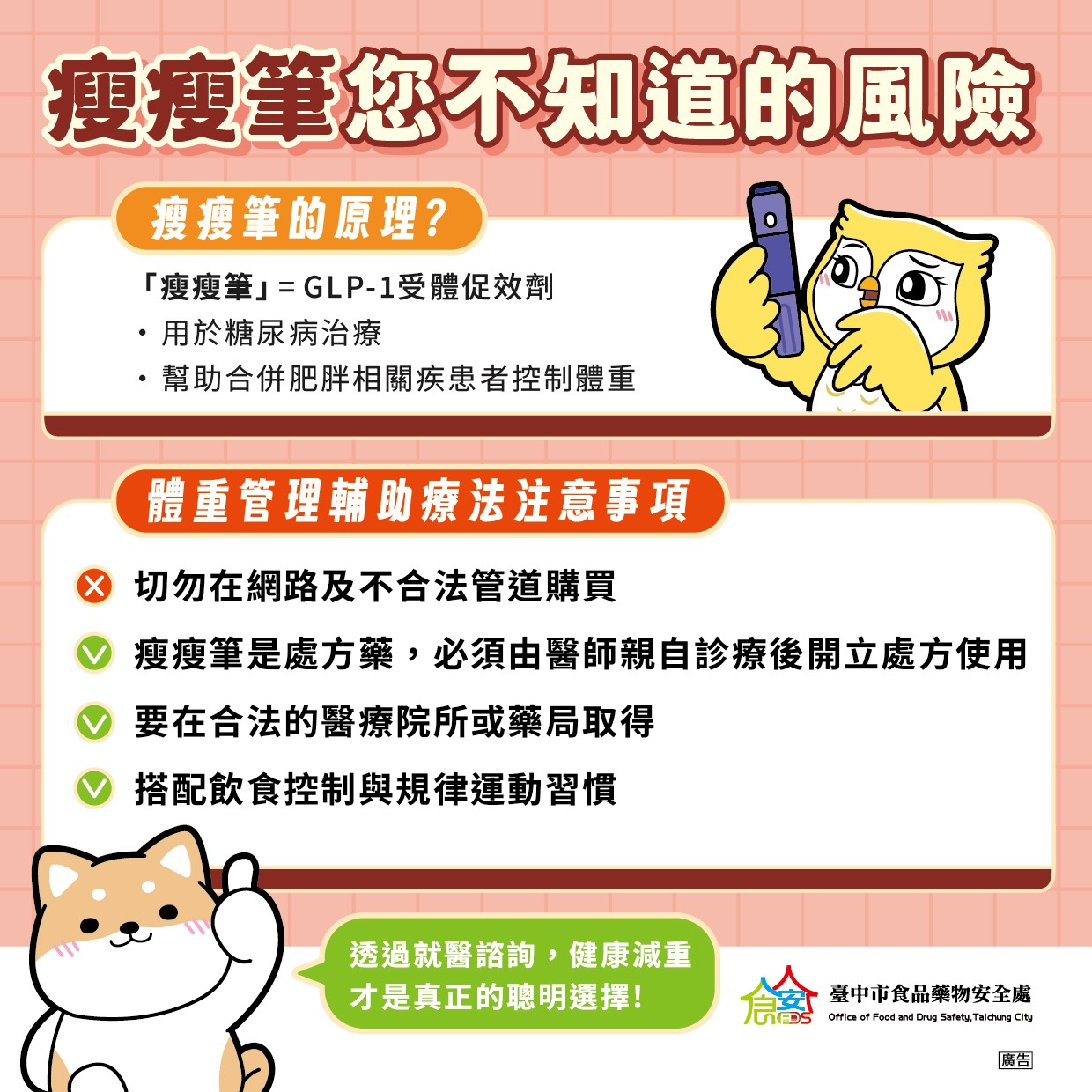 瘦瘦筆您不知道的風險 瘦瘦筆(針)的原理 瘦瘦筆」=GLP-1受體促效劑 1. 用於糖尿病治療 2. 幫助合併肥胖相關疾患者控制體重 體重管理輔助療法注意事項 1. 切勿在網路及不合法管道購買 2. 瘦瘦筆是處方藥,必須由醫師親自診療後開立處方使用 3. 要在合法的醫療院所或藥局取得 4. 搭配飲食控制與規律運動習慣